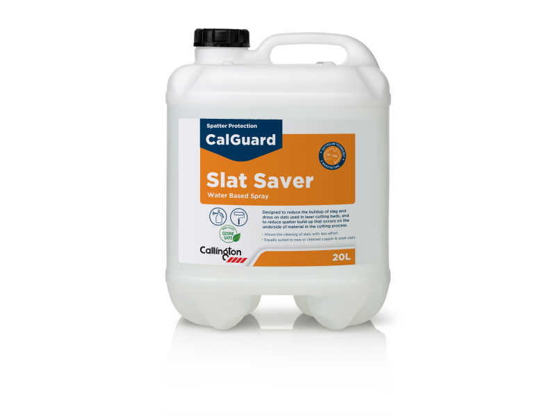 CalGuard Slat Saver is a water based, non-aerosol, non-flammable agent designed to reduce the buildup of slag and dross on slats used in laser cutting beds, and to reduce spatter that occurs on the underside of material in the cutting process. Slat Saver can be applied to steel and copper slats commonly used in cutting beds.