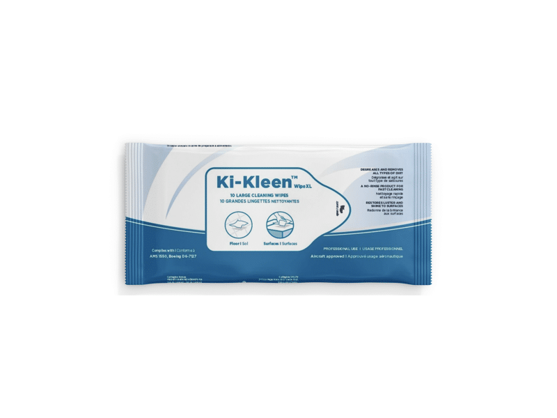 Ki-Kleen™ Wipe is a unique and convenient cleaning wipe, multi-purpose for floors and interior surfaces, approved for aeronautical use. Its practical format allows it to be used discreetly in-flight, helping to keep passengers comfortable and clean. Thanks to the degreasing and cleaning properties of Ki-Kleen™ and a honeycomb texture wipe, the Ki-Kleen™ Wipe effectively tackles various types of dirt. Convenient for cleaning cabin surfaces, so as surfaces and floors of galleys and toilets, it leaves no streaks. Ki-Kleen™ is a non-flammable liquid cleaner with broad material compatibility, specifically developed for the aerospace industry. Ki-Kleen™ Wipe can be safely used on a wide range of materials such as polypropylene, polyethylene, vinyl, plastic, aluminium, stainless steel, glass, and polycarbonate.