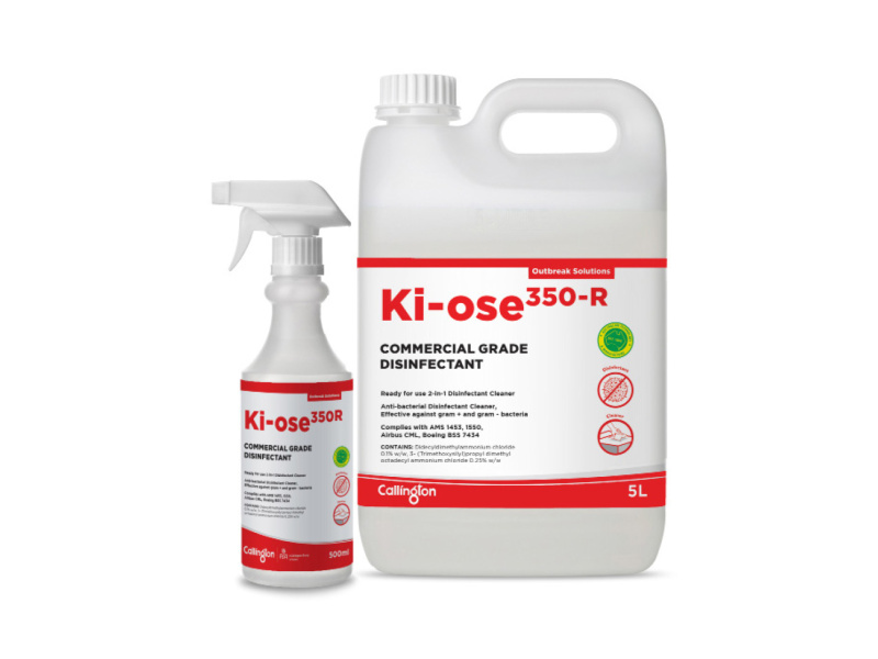 Ki-ose 350R is a ready to use 2-in-1 high performance residual disinfectant cleaner for all hard surfaces. It provides immediate broad-spectrum disinfection in aviation, industrial, institutional, healthcare and household settings, as well as being a daily defense against germs.